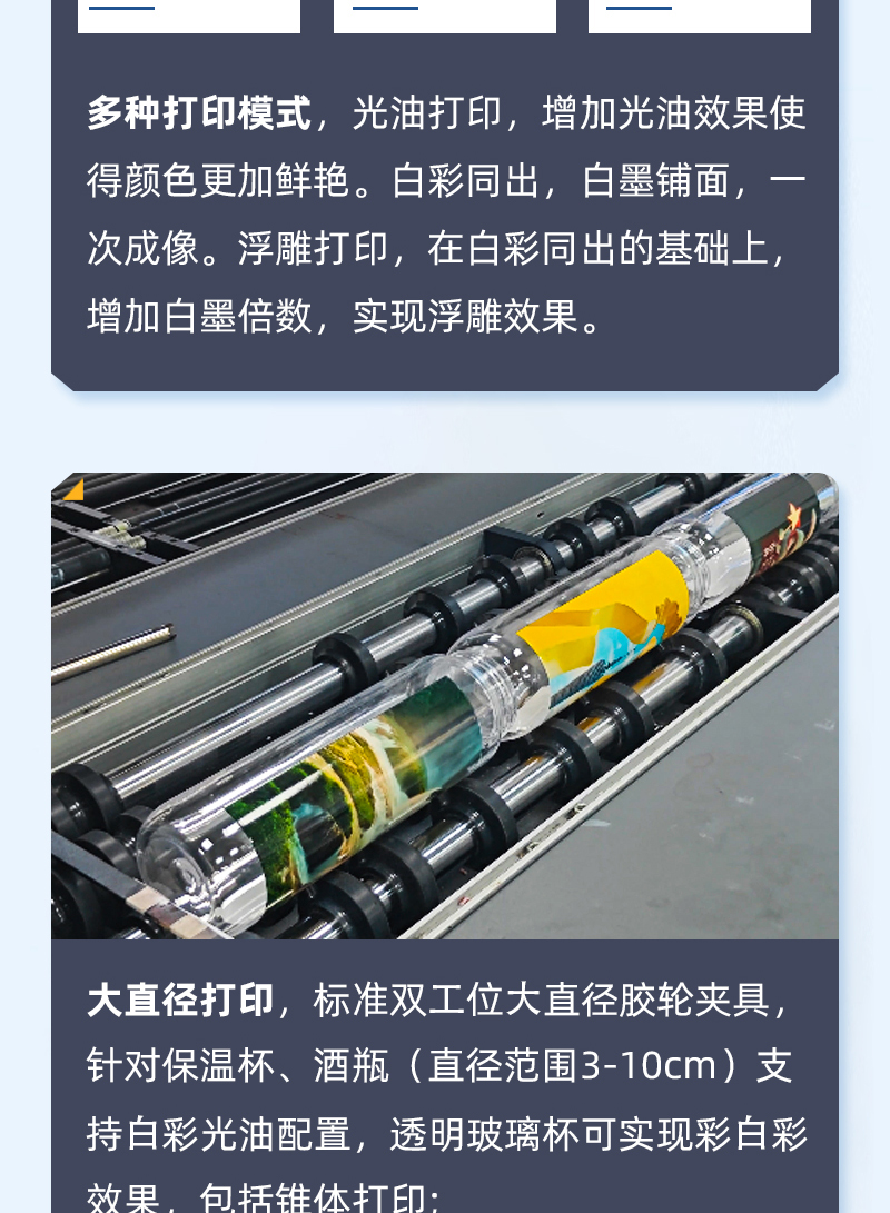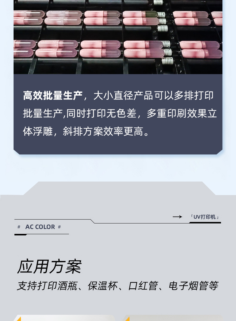 傳統(tǒng)的絲網(wǎng)印刷需要菲林制版,制版成本200元一張,工藝復(fù)雜,生產(chǎn)周期長(zhǎng)。只可打印單色打印成本較昂貴,做好的絲網(wǎng)印點(diǎn)不能消除,需要批量生產(chǎn)來降低成本,無法達(dá)到小批量或個(gè)別產(chǎn)品印刷。潤(rùn)彩圓柱體打印機(jī),采用高科技UV數(shù)碼印刷工藝,全新工業(yè)化,雙工位,雙夾具生產(chǎn)每小時(shí)100-200個(gè),不需要復(fù)雜的排版設(shè)計(jì),不用制版,適合多種類、個(gè)性化印刷。不限制最少數(shù)量,減少了印刷成本與時(shí)間。只需要簡(jiǎn)單的圖片處理,計(jì)算好相關(guān)數(shù)值后直接用uv打印軟件進(jìn)行操作。